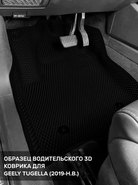Автомобильные 3д коврики для Geely Tugella (2019-н.в) в салон авто и багажник сделаны из инновационного полимерного материала EVA, изысканная структура в виде ячеек не дает воде, пыли и снегу разлетаться по салону машины и багажнику. 3д коврики зафиксированы на полу определенными клипсами, соответствующими Geely Tugella (2019-н.в), и не двигаются в процессе езды.